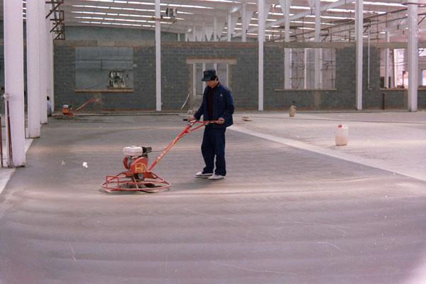 4、收光:待地面接近終凝時(shí),將抹光機(jī)的原盤去除,使用機(jī)械抹刀隨著地面的硬化進(jìn)程,對(duì)地面進(jìn)行3—4次的收光。